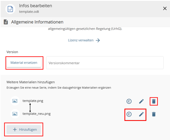 Sie benötigen ein „Hauptobjekt“, d.h. eine Datei, die die ganze OER repräsentiert. Diese laden Sie ganz normal ins System und vergeben die Metadaten. Diesem Hauptobjekt können Sie im Dialog „Infos bearbeiten“ im Abschnitt „Weitere Materialien hinzufügen“ um weitere Dateien oder Links ergänzen. Die so ergänzten Materialien bilden zusammen mit dem Hauptobjekt eine Serie und haben zunächst die gleichen Metadaten. Titel, Lizenz und Urheber der Serienelemente können jedoch bei Bedarf individuell angepasst werden. Dazu nutzen Sie die Symbole neben den Materialnamen im Dialogfenster. Ebenso können die einzelnen hinzugefügten Materialien dort auch wieder gelöscht werden. Die Reihenfolge der Serienelemente können per Drag&Drop bei den kleinen Icons vor den Materialnamen geändert werden.